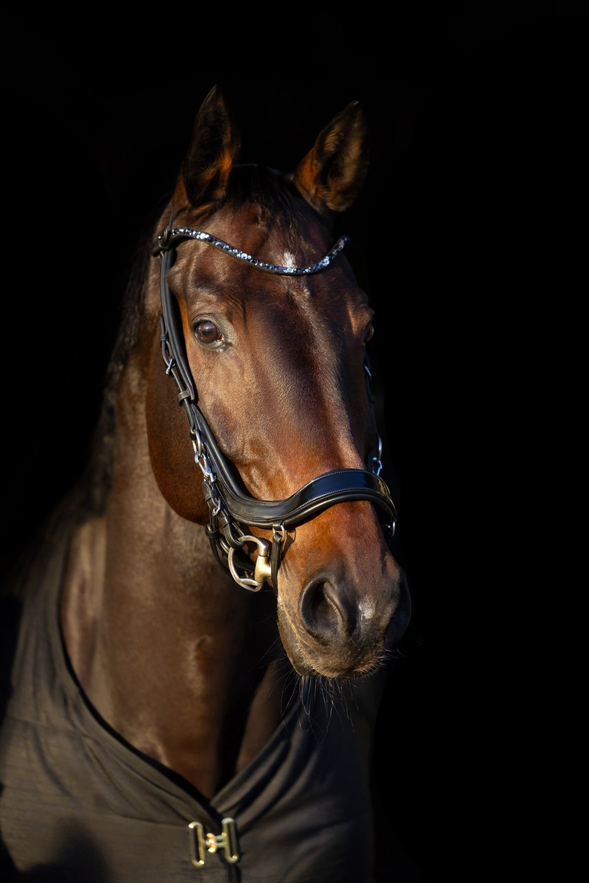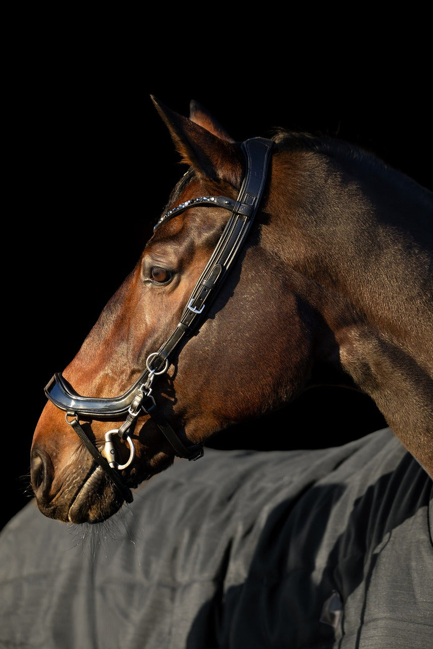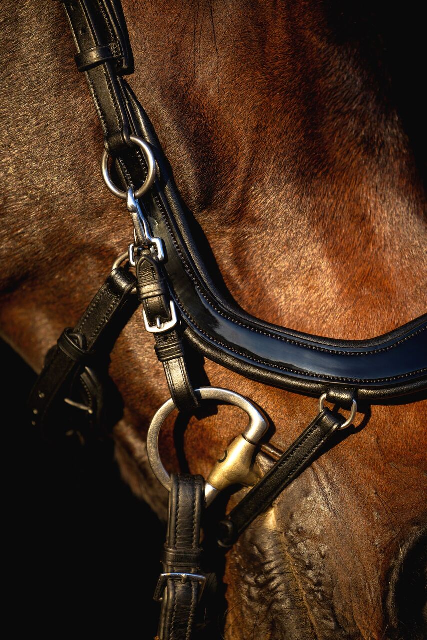 The contoured shape of the bridle relieves pressure on the horse's sensitive areas, ensuring freedom of movement and comfort even during intense training. The delicately varnished finish gives the entire piece a subtle shine, while the decorative browband with crystals emphasizes elegance and unique style.