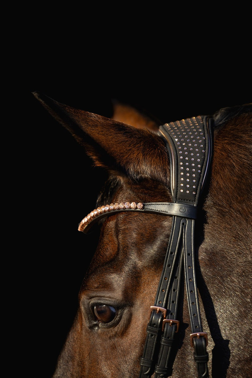 Zdobienia w kolorze rose golden nadają mu luksusowy charakter subtelne kryształki pięknie odbijają światło, podkreślając finezyjne wykończenie całego ogłowia.