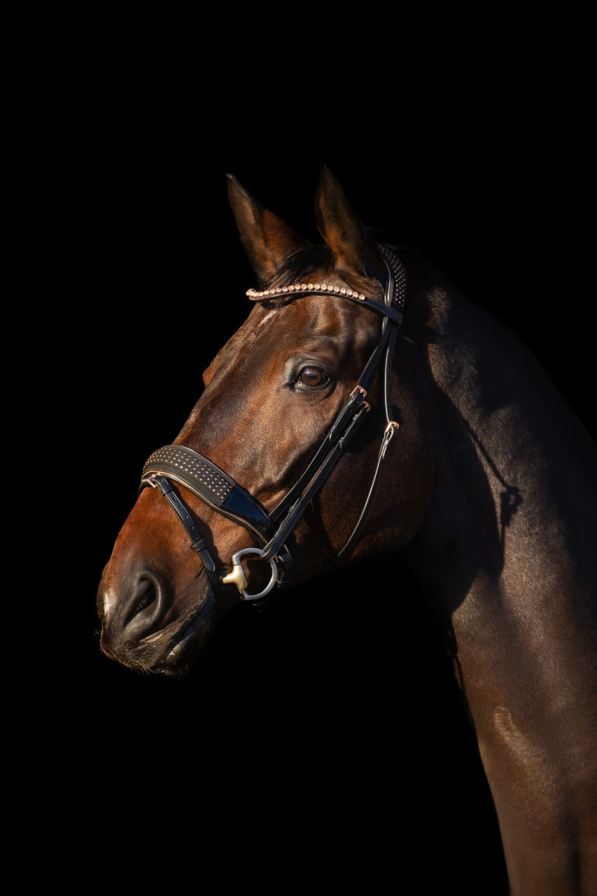 Szeroki, anatomicznie profilowany nachrapnik szwedzki zapewnia równomierny nacisk i komfort podczas treningu. Delikatne podszycie chroni skórę konia przed otarciami, a solidne okucia w kolorze różowego złota dopełniają harmonijnego wyglądu.