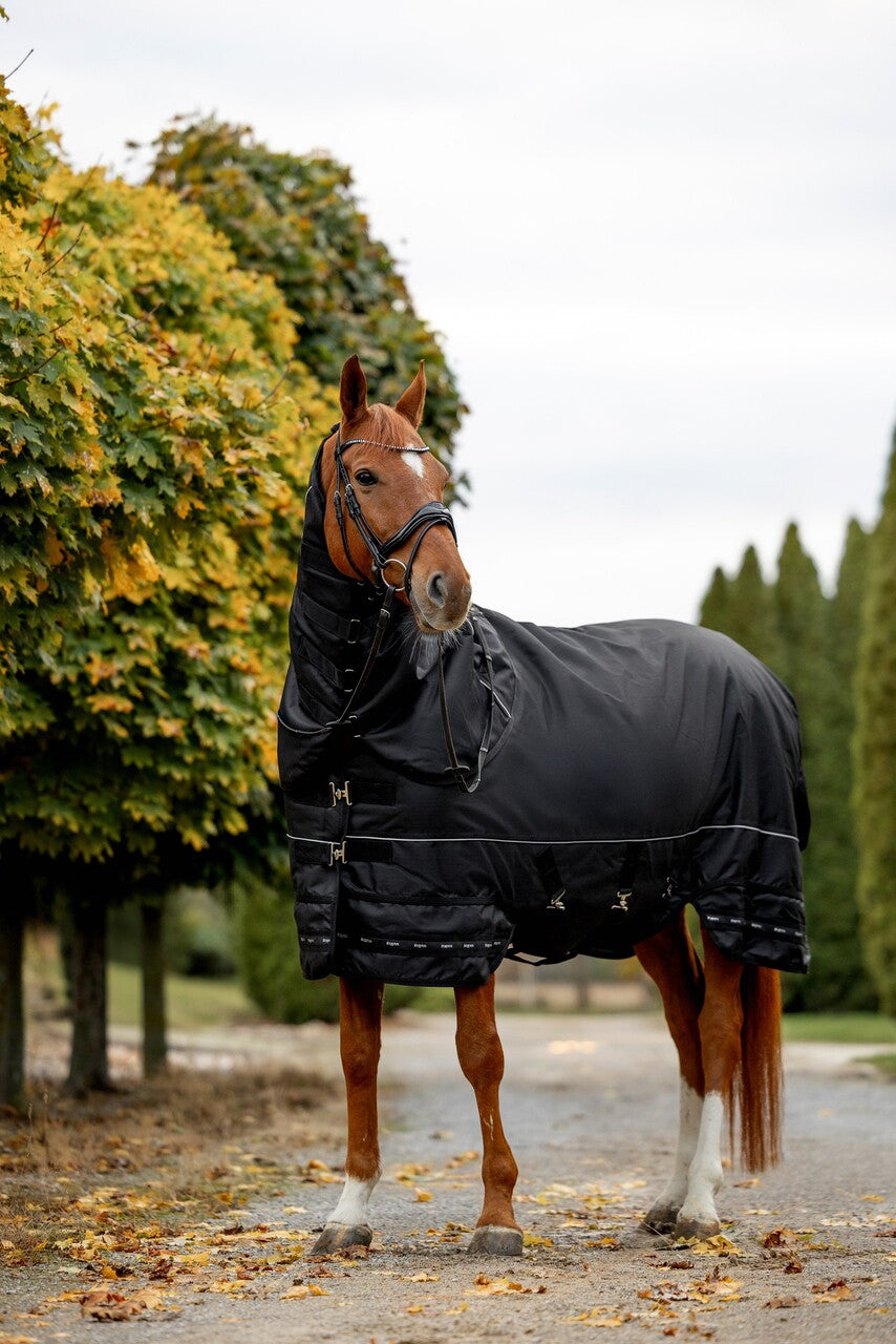 Wytrzymała i elegancka derka padokowa stworzona z myślą o maksymalnej ochronie i komforcie konia w chłodniejsze dni. Wykonana z materiału 1200D o wysokiej odporności na rozdarcia i wilgoć, z 200 g wypełnienia, które zapewnia doskonałą izolację termiczną. Wyposażona w odpinany kaptur, pozwala dopasować poziom okrycia do warunków pogodowych. Całość zdobi logo Equus biegnące przez derkę i kaptur, nadając jej nowoczesny, rozpoznawalny charakter. Model Blacky to idealne połączenie trwałości, funkcjonalności i stylu – stworzony dla koni, które spędzają dużo czasu na padoku.