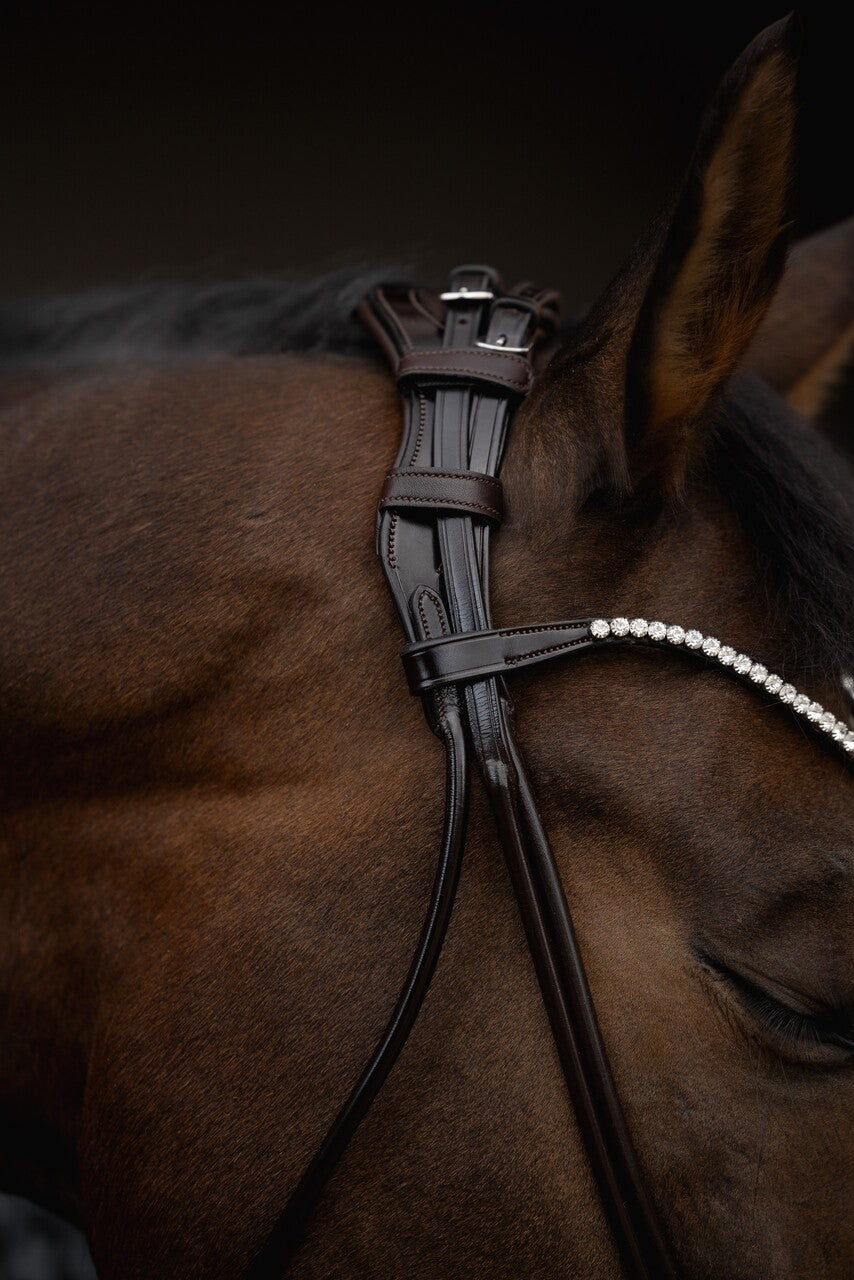 Luksusowe ogłowie wykonane z włoskiej skóry najwyższej jakości w eleganckim odcieniu ciemnego brązu i czerni. Model Embera zachwyca precyzyjnym, okrągłym szyciem i dopracowanymi detalami, które nadają mu wyjątkowej lekkości i elegancji. Subtelny, błyszczący naczółek z kryształkami pięknie podkreśla końską głowę, a anatomiczny kształt potylicy oraz miękkie podszycie zapewniają maksymalny komfort. Idealne zarówno do treningu, jak i na zawody dla tych, którzy cenią połączenie stylu, precyzji i wygody.