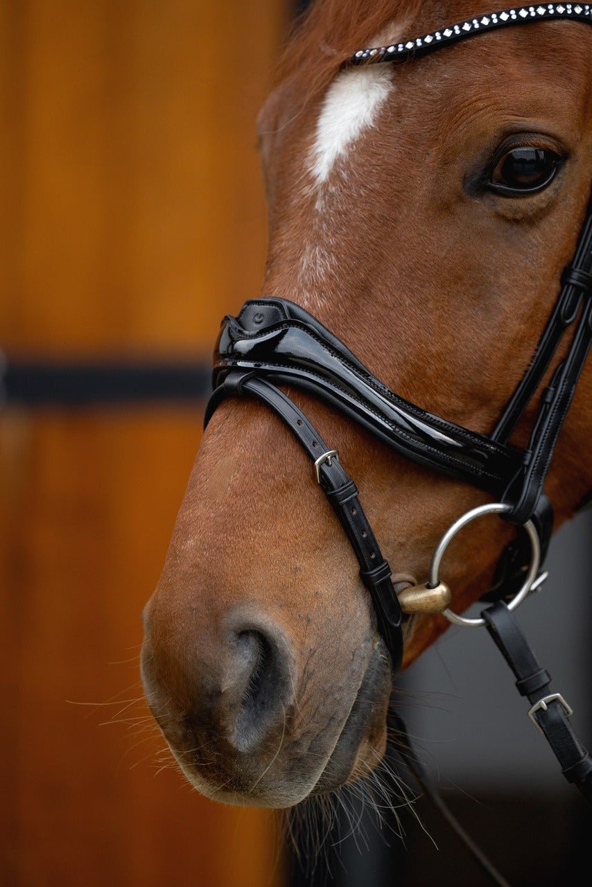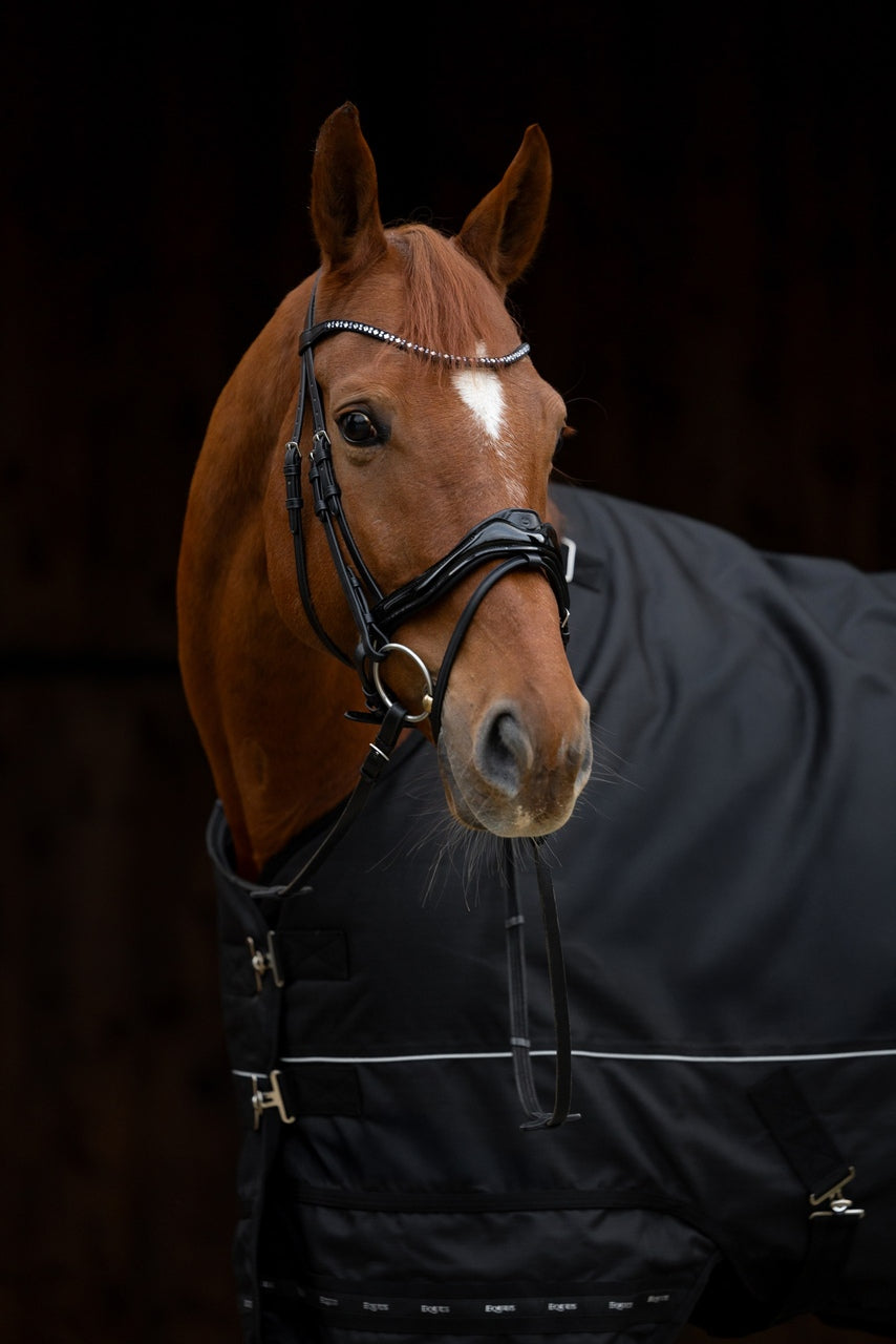 Ekskluzywne ogłowie o wyjątkowo eleganckim wykończeniu, wykonane z najwyższej jakości miękkiej skóry hiszpańskiej. Posiada lakierowany, anatomiczny nachrapnik oraz wyciągany skośnik z subtelnym logo Equus, co nadaje mu nowoczesny, dopracowany charakter. Cienki, profilowany naczółek z kryształkami pięknie podkreśla głowę konia i delikatnie odbija światło. Ogłowie Premio Black to połączenie najwyższej jakości wykonania, komfortu i stylu, stworzone z myślą o wymagających jeźdźcach.
