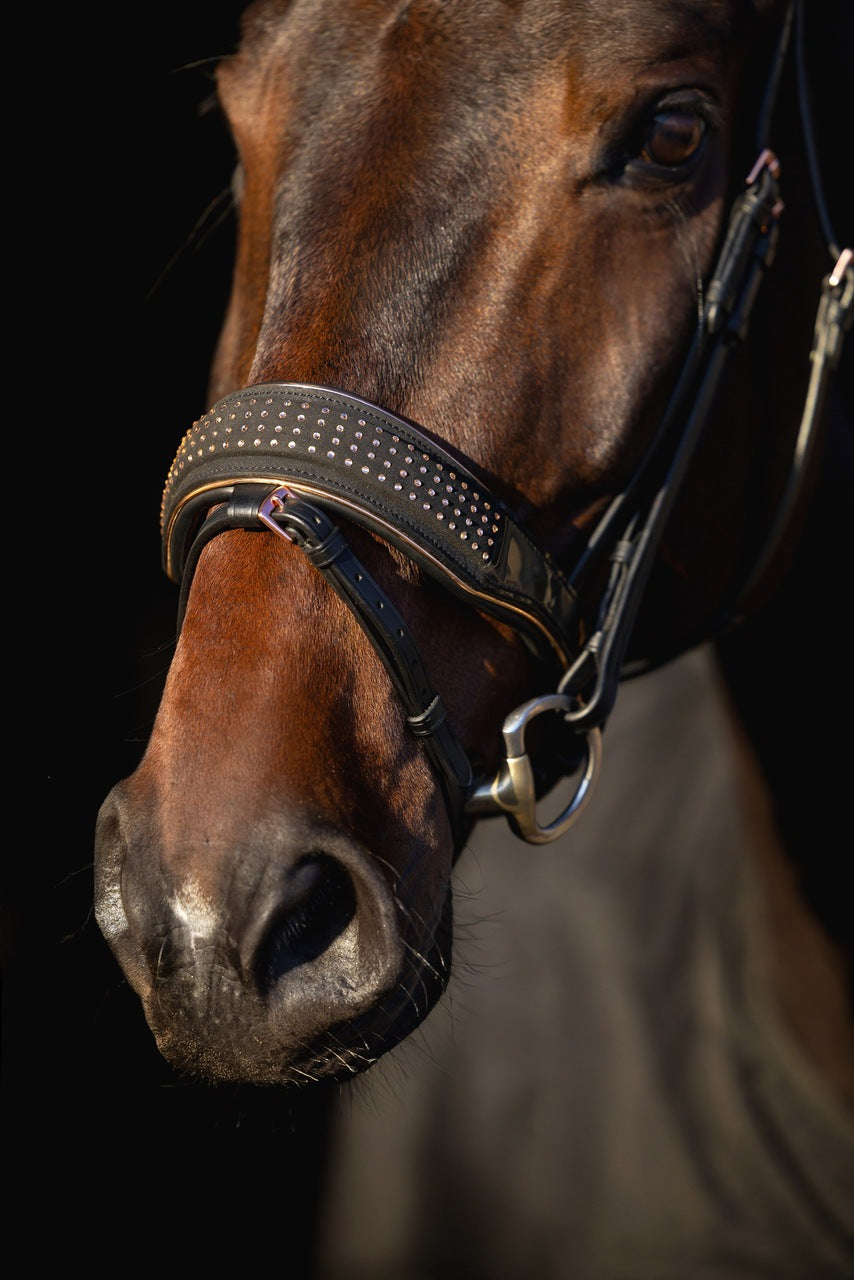 Szeroki, anatomicznie profilowany nachrapnik szwedzki zapewnia równomierny nacisk i komfort podczas treningu. Delikatne podszycie chroni skórę konia przed otarciami, a solidne okucia w kolorze różowego złota dopełniają harmonijnego wyglądu.